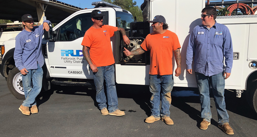 L to R: Colter Shannon, Toby Stoneburner, Matt Perez, and Austin Wendt, are in Paradise, Calif. to help with water repairs after the destructive November 2018 Camp Fire. Photo: Fallbrook Public Utility DistrictFallbrook PUD Crews Help Paradise Camp Fire Recovery Efforts